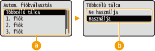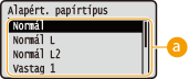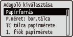 Általános beállításokA beállítások megegyeznek a Beállítás menü <Papírforrás> elemében található lehetőségekkel. Az itt megadott beállítások érvényesek a <Papírforrás> menüpont beállításaira is.