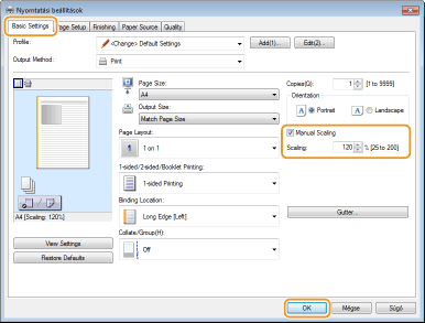 Adja meg a nyomtatási arányt a [Scaling] (Méretezés) beállításban