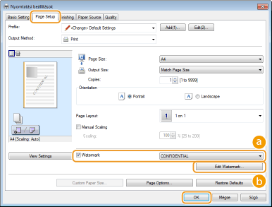 Az egyes fülekre kattintva beállíthatja a vízjel szövegét, színét és nyomtatási pozícióját. A további tudnivalókért kattintson a nyomtató-illesztőprogram [Help] (Súgó) menüpontjára.