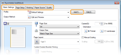 Kattintson az [Basic Settings] (Alapbeállítások), [Page Setup] (Oldalbeállítás), [Finishing] (Befejező művelet), [Paper Source] (Papírforrás), vagy [Quality] (Minőség) fülekre, és adja meg mindegyik képernyőn igény szerint a nyomtatási beállításokat.