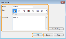 Adjon meg egy profilnevet a [Name] (Név) mezőben, válasszon egy ikont, majd kattintson az [OK] gombra.