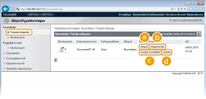 A gyári alapbeállítások megakadályozzák bizonyos műveleteknek – például a nyomtatandó dokumentumok törlésének vagy a nyomtatási feladat megszakításának – általános felhasználói módban történő elvégzését. Amennyiben általános felhasználói módban kíván dokumentumokat kezelni, jelentkezzen be rendszerkezelői módban, és engedélyezze az [Általános felhasználó műveletének engedélyezése] funkciót. Végfelhasználók dokumentumkezelésének engedélyezése