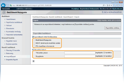Válassza ki az exportálandó beállításokat, majd adja meg a titkosítási jelszót.