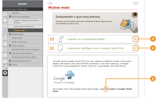 Exibe os tópicos do capítulo selecionado. Se "+" for exibido no tópico, clicar nele exibe as subseções daquele tópico. Clique em "-" para fechar os tópicos expandidos.