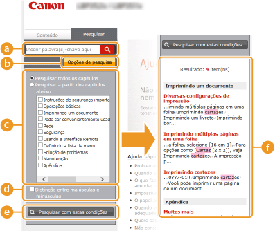 Exibe os resultados de pesquisa das páginas que contenham as palavras-chave especificadas. A partir dos resultados, localize a página que você está procurando e clique no título do tópico da página. Se os resultados não puderem ser exibidos em uma página, clique