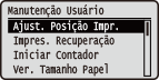 As definições de ajuste da máquina, incluindo a correção da posição de impressão de cada fonte de papel e melhoria da qualidade de impressão estão listadas com descrições breves. Você pode especificar essas configurações quando a máquina está offline. As predefinições são marcadas com uma cruz (