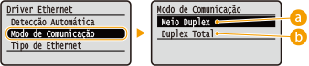 Selecione <Meio Duplex> ou <Duplex Total> ![]() ![]() <Meio Duplex>Envia e recebe dados de comunicação de forma alternativa. Selecione-a quando a máquina estiver conectada a um dispositivo de rede usando meio duplex.