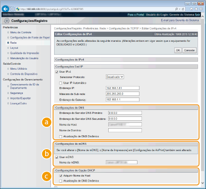 Marque a caixa de seleção para atualizar dinamicamente os registros DNS sempre que o endereço IP da máquina é alterado. Para especificar o(s) tipo(s) de endereços que deseja registrar no servidor DNS, marque a caixa de seleção para [Registrar Endereço Manual], [Registrar Endereço Declarável] ou [Registrar Endereço Sem Estado]. [Configurações de mDNS]/[Configurações de Opção DHCP][Usar mDNS]