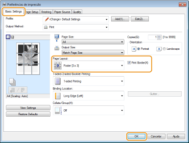 As configurações de tamanho de cartaz não podem ser selecionadas quando a impressão dos dois lados estiver ativada. Selecione [Impressão de um lado] em [Impressão de um lado/dos dois lados/de livreto] e depois selecione uma configuração de tamanho de cartaz.