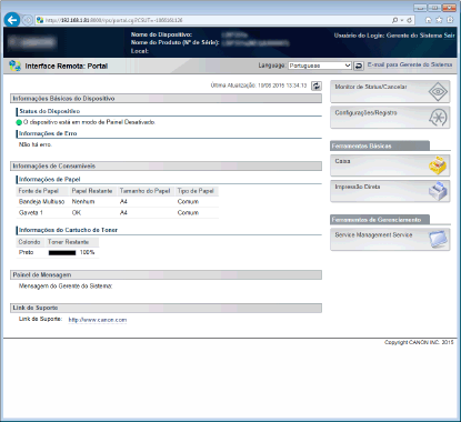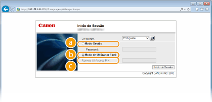 Você pode executar todas as operações de interface do usuário remoto e configurações. Digite a senha do Gerente do Sistema no [Senha].