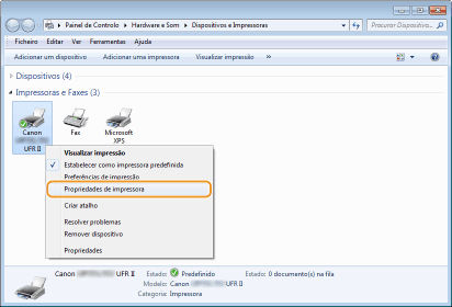 Clique com o botão direito no ícone da sua impressora e clique em [Propriedades da impressora] ou [Propriedades].