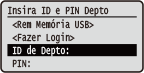 Quando os usuários tentam imprimir um arquivo no dispositivo de memória USB ou um documento armazenado no cartão SD no painel de operação, a tela de autenticação é exibida. Digite a ID de departamento e o PIN, selecione <Login> e pressione  .
