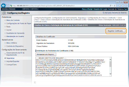 Não é possível usar o par de chaves gerado pela Solicitação de Assinatura de Certificado (CSR) a não ser quando o certificado está registrado. Até que a autoridade de certificação emita o certificado digital, registre-o usando o procedimento abaixo.