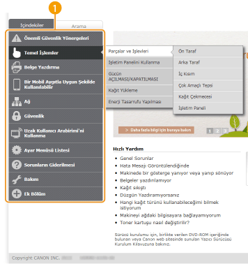 Seçilen bölüme yönelik konuları görüntüler. Konuda "+" işareti varsa, bu işaretin tıklatılması ilgili konunun alt bölümlerini görüntüler. Genişletilen konuyu kapatmak için "-" işaretini tıklatın.