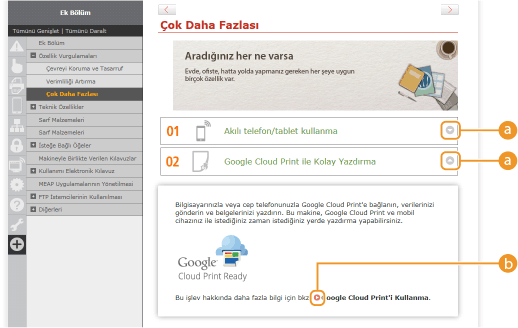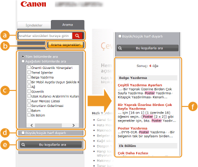 Belirtilen anahtar sözcükleri içeren sayfaların arama sonuçlarını görüntüler. Bu sonuçlardan, aradığınız sayfayı belirleyin ve sayfanın konu başlığını tıklatın. Sonuçlar tek bir sayfada görüntülenemiyorsa, ilgili sayfada bulunan sonuçları görüntülemek üzere