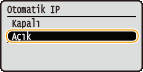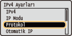 tuşuna basın.HCP, BOOTP ve RARP protokollerinden yalnızca birini kullanabilirsiniz. Eğer seçilen protokol, <Açık> olarak ayarlanmışsa, diğer iki protokol otomatik olarak <Kapalı> biçiminde ayarlanır.