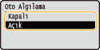 <Kapalı> seçeneğini belirleyin ve