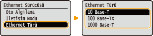 Ethernet, yerel ağ (LAN) üzerinde veri iletişimi standardıdır. İletişim modunu (yarı dupleks/tam dupleks) ve Ethernet türünü (10BASE-T/100BASE-TX/1000BASE-T) ayarlayabilirsiniz. Genellikle makine, varsayılanlar değiştirilmeden kullanılabilir (Ethernet Sürücüsü) ancak bu ayarları ağ ortamınıza uyacak şekilde değiştirebilirsiniz.