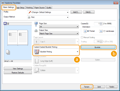Ayrıntılı ayarları gereken biçimde belirtmek için [Booklet] (Kitapçık) öğesini tıklayın