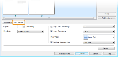 Kopya sayısı veya 1 taraflı/2 taraflı yazdırma gibi yazdırma ayarlarını belirtme ekranını görüntülemek için [Print Settings] (Yazdırma Ayarları) sekmesini tıklatın. Burada belirtilen ayarlar, yazdırma işinin tamamına uygulanır.