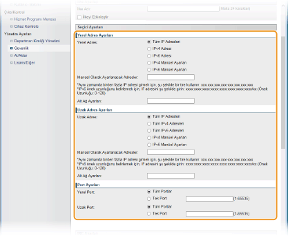 IPSec uygulanacak tek bir IPv6 adresi veya IPv6 adresleri aralığı belirtmek için seçin. [Manüel Olarak Ayarlanacak Adresler] Metin kutusuna IPv6 adresini (veya aralığı) girin.