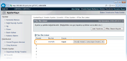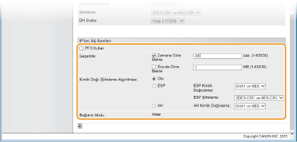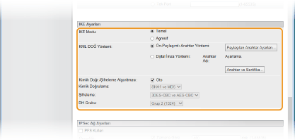 IPSec ayarlarını yapılandırmadan önceMakinenin iletişimde bulunacağı iletişim sisteminde IPSec ayarlarını denetleyin. İşletim sistemi ayarlarının ve makine ayarlarının yanlış bir kombinasyonu, IPSec iletişimi devre dışı bırakır.