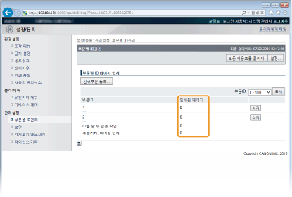 확인 결과를 인쇄하려면페이지 카운트를 0으로 초기화하려면각 부서에 대한 페이지 카운트를 0으로 초기화하려면, [부문ID] 밑의 텍스트 링크를 클릭하고, [카운트 클리어]