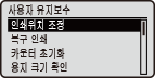 각 용지 공급원에 대한 인쇄 위치 조정 및 인쇄 품질 향상을 비롯한 기기 조정 관련 설정이 간단한 설명과 함께 나열됩니다. 이 설정은 기기가 오프라인일 때 지정할 수 있습니다. 기본 설정에는 칼표(