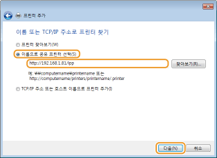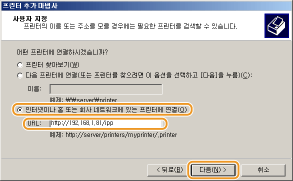 [인터넷이나 홈 또는 회사 네트워크에 있는 프린터에 연결]을 선택하고 연결 대상을 입력한 후 [다음]을 클릭합니다.