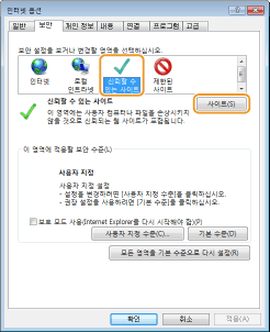 [보안] 탭에서 [신뢰할 수 있는 사이트]를 선택하고 [사이트]를 클릭합니다.