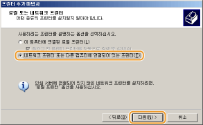 [네트워크 프린터 또는 다른 컴퓨터에 연결되어 있는 프린터]를 선택한 후 [다음]을 클릭합니다.