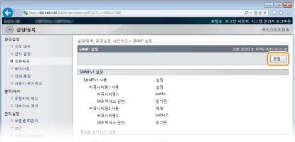 SNMP(Simple Network Management Protocol)는 MIB(Management Information Base)를 사용하여 네트워크의 통신 장치를 모니터링하고 제어하기 위한 프로토콜입니다. 본 기기는 SNMPv1 및 보안 기능이 개선된 SNMPv3을 지원합니다. 문서를 인쇄하거나 리모트 UI를 사용할 때 컴퓨터에서 기기의 상태를 확인할 수 있습니다. SNMPv1 또는 SNMPv3를 각각 또는 동시에 모두 활성화할 수 있습니다. 네트워크 환경과 사용 목적에 맞게 각 버전의 설정을 지정합니다.