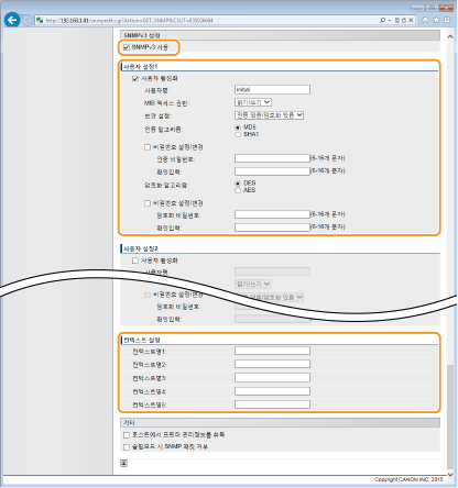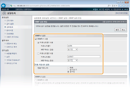 확인란을 선택하면, Canon 소프트웨어 imageWARE Series와 같이, SNMP 프로토콜을 사용하는 응용 프로그램의 기기 접근이 비활성화 될 수 있습니다.