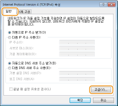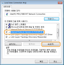 [인터넷 프로토콜 버전 4(TCP/IPv4)] 또는 [인터넷 프로토콜] 확인란을 선택한 후 [속성]을 클릭합니다.