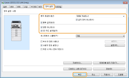 UFR II 프린터 드라이버 외에도 PCL6 프린터 드라이버를 사용할 수 있습니다. 사용 가능한 인쇄 설정은 프린터 드라이버에 따라 달라집니다. 자세한 내용을 확인하려면 각 프린터 드라이버 화면에서 [도움말]을 클릭하십시오.