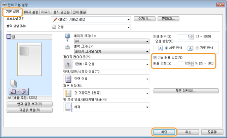 일부 응용 프로그램에서 확대/축소 설정은 프린터 드라이버보다 높은 우선 순위가 부여됩니다.