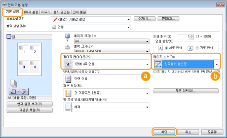 여러 페이지를 한 장에 인쇄할 수 있습니다. 예를 들어, [1면에 4쪽 인쇄] 또는 [1면에 9쪽 인쇄]로 4페이지 또는 9페이지를 한 장에 인쇄할 수 있습니다. 용지를 절약하거나 문서를 축소판으로 보려면 이 기능을 사용합니다.