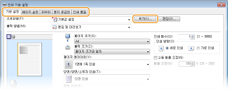 "A4 크기 용지에 단면 가로 방향"과 같은 설정 조합을 인쇄할 때마다 매번 지정하는 것은 시간 낭비일 것입니다. 이처럼 자주 사용하는 인쇄 설정 조합을 "프로파일"로 등록하고나면, 인쇄 시 목록에서 이러한 프로파일 중 하나를 선택하기만 하면 됩니다. 이 단원에는 프로파일을 등록하고 해당 프로파일을 사용하여 인쇄하는 방법이 나와있습니다.