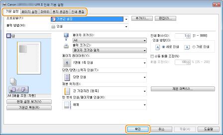 필요한 경우 [기본 설정], [페이지 설정], [마무리], [용지 공급원] 또는 [인쇄 품질] 탭을 클릭하고 각 화면에서 인쇄 설정을 지정합니다.