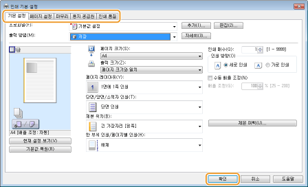 필요한 경우 [기본 설정], [페이지 설정], [마무리], [용지 공급원], 또는 [인쇄 품질] 탭을 클릭하여 각 화면에서 인쇄 설정을 지정합니다.