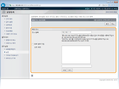 IP 주소 또는 포트 번호가 잘못 입력되면 리모트 UI에서 기기에 액세스하지 못할 수도 있으며, 이런 경우에는 <주소 필터>를 <해제>로 설정해야 합니다. 주소 필터