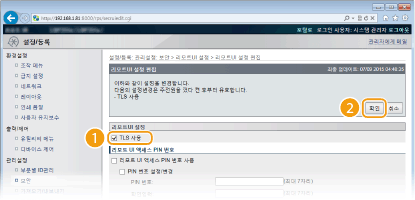 [TLS 사용] 리모트 UI 통신에 TLS를 사용하는 경우에는 확인란을 선택하고, 사용하지 않으면 확인란 선택을 해제합니다.