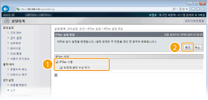 조작 패널 사용조작 패널의 설정 메뉴에서도 IPSec 통신을 활성화 또는 비활성화 할 수 있습니다. IPSec