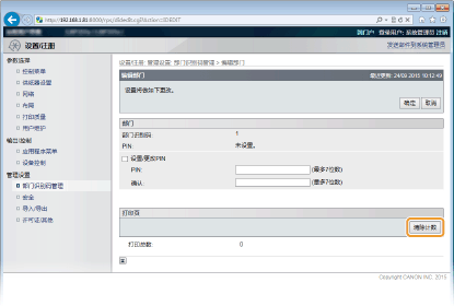 当希望将每个部门的页面计数清除为零时,单击 [部门识别码] 下的文本链接并单击 [清除计数]