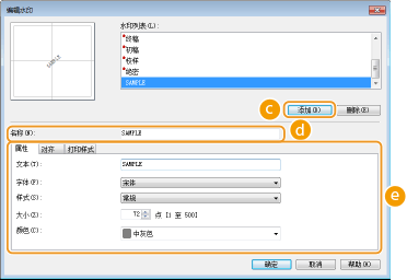 单击各选项卡指定水印的文本、颜色或打印位置。更多信息,请单击打印机驱动程序画面上的 [帮助]。