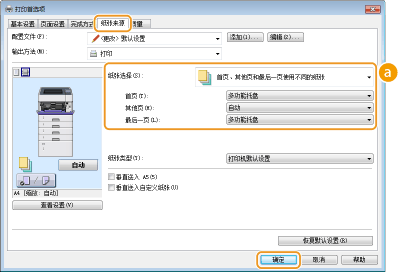 首页、正文页和最后一页分别使用不同的纸张。例如,可为 [首页:] 指定多功能托盘中的纸张,为 [其他页:](正文页)指定纸盒中的纸张,并为 [最后一页:] 指定多功能托盘中的纸张。还可在 [纸张类型] 中指定纸张类型打印。