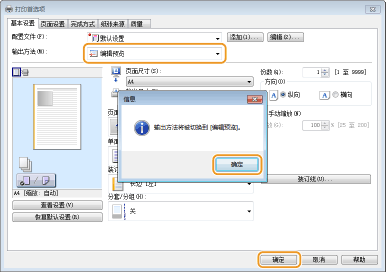 显示打印机驱动程序的打印设置画面。可用设置比使用普通打印方法时的设置更少。