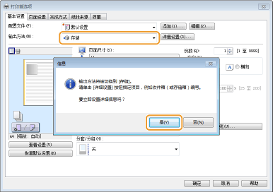 选择 [输出方法:] 中的 [存储],然后单击 [是]。