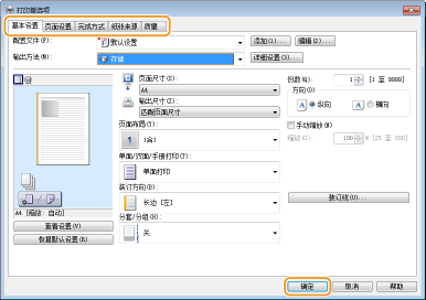 单击 [基本设置]、[页面设置]、[完成方式]、[纸张来源] 或 [质量] 选项卡,根据需要在各画面上指定打印设置。