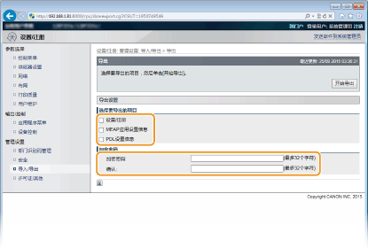 使用最多 32 个字符输入加密要导出的数据的密码。在 [确认] 中输入同一密码。如果未设置密码,将无法进行数据导出。